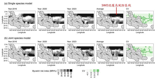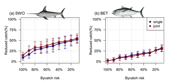 本研究提出一套可量化漁業與保育之間權衡的新方法,提出使用聯合物種時空模型(joint-species spatio-temporal model),來建立了一套同時考量保育需求與漁業維生的量化評估框架。透過整合混獲風險(如劍旗魚,SWO)與商業價值較高的目標魚種(如大目鮪,BET)的空間分布,來評估不同空間管理情境下資源保育與漁業產量的雙向影響,並協助管理機構在進行空間漁業管理操作條件下做出「最小漁業損失、最大保育效益」的決策。