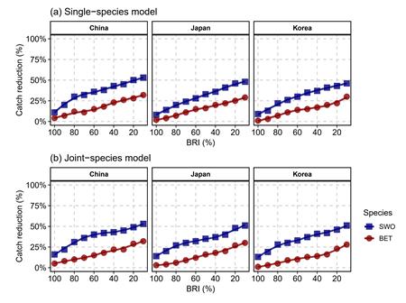 為協助管理單位更有效地規劃空間禁魚區(spatial fishery closure)管制,本研究進一步提出「混獲風險指數」(Bycatch Risk Index, BRI)來規劃可能的空間禁魚區,將劍旗魚混獲熱區與大目鮪密度熱區整合,系統性的量化不同禁魚區下的漁業與保育權衡(trade-off)。結果顯示劍旗魚禁魚區主集中在 0°- 5°S、110°-140°W,且近年高風險區有向西擴張至 160°W 的趨勢,兩個模型的主要差異在於風險評估的保守程度:單物種模型呈現較大的低風險區與較高的年間變異(CV較大),而多物種模型則將更多海域判定為最高風險並顯示較穩定的核心區風險(圖二)。此外,如果使用 60% BRI 的中度門檻來制訂禁魚區的狀況下,可達到最佳平衡,即為劍旗魚混獲量可減少約 36%,而大目鮪漁獲量僅下降 12%。此外,相較於單物種模型,多物種模型能藉由捕捉兩物種之間的時空依存關係,使得模型的套適力較好(AIC較低),並可提供更有效率的空間禁魚區域規劃(圖三)。